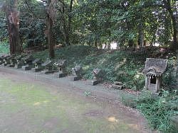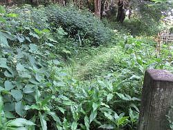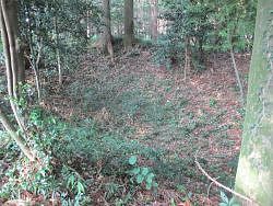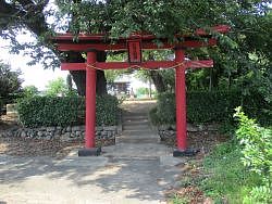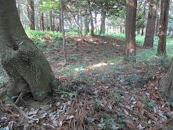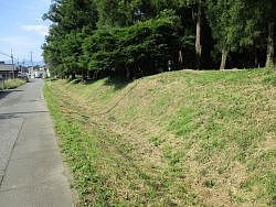 正式には二之宮赤城神社。境内の西に広い公民館に駐車すれば、土塁と堀跡が見える。道路は掘りを埋めて造成してる。これだけ立派な堀跡があり、城館として情報がないのが不思議でもある。境内は広く北半分は林になり、南半分に諸建物が建っている。南の鳥居からの参道脇に堀跡を思わせる水路がある。