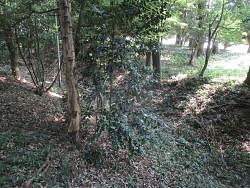 門前の赤い神代橋で水路は東に続いている。境内東口にも見た目で堀と分かる凹みが見えるが、全体的に堀(水路)は藪化している。本殿西側には土塁・内堀がよく残っており、背後(北)にも堀・土塁が確認出来る。