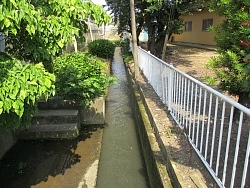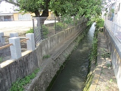 力丸古城跡は貞治6年(1367)に力丸氏により築かれたようだ。城を感じさせる遺構はないようだが、町の会議所裏に石製城址碑が置かれている。碑だけを見れば、なにやらすごい城址を思わせる。会議所が建つこの辺りが主郭だったのか。会議所の北と東に水路が巡り、綺麗な水が流れている。堀の名残だろうか。