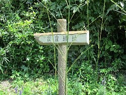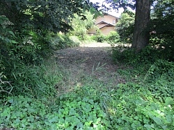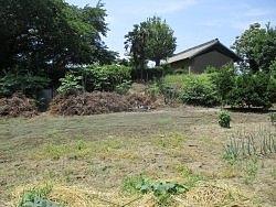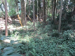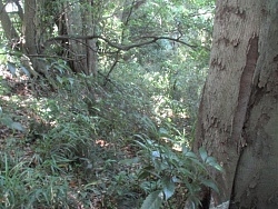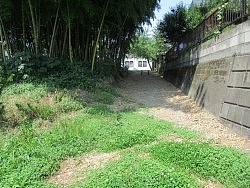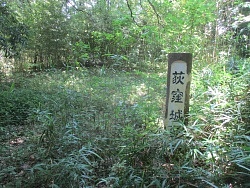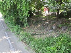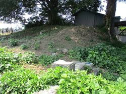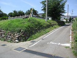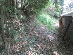 主郭の東にも郭があり、土塁・堀が確認出来る。その南には民家がある広い郭がある。この辺りは私有地なのであまり中まで散策できない。南に下れば南の散策路入口に出る。この下った道も主郭南の郭と東の郭を隔てる堀だったのではないか。