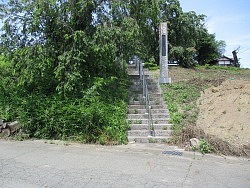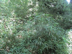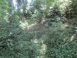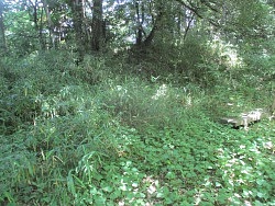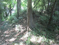 荻窪南公園の南入口の道路に駐車する。城址標識があり位置的に西の散策路入口らしい。駐車場は見当たらないが、公園入口に草が多く不明な空き地があり、もしかして駐車場か。時季が悪く夏草が生い茂っている中を先へ。公園は南北に長い谷戸で、城の西を守る。すぐに土橋と横堀があるが、篠などが多く分かりづらい。かき分けて進むと、ここが主郭らしく劣化した説明板とベンチがある。狭い郭だが北側に土塁、堀が遺っている。