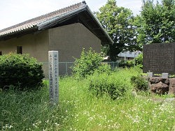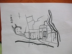 上泉自治会館の広い駐車場を借りる。駐車場の北側に、新陰流の祖・上泉伊勢守の大きな顕彰碑・銅像があり、来訪者用の記帳ノート、一枚刷り縄張図が備えられている。郷蔵が建つ本丸は20数m四方の狭い郭だが、自治会館建設で南半分を削られたらしい。