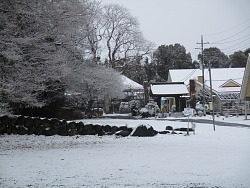 寒波の影響で山は雪だが、この辺りは予想していなかった。細い道路は白くなり止まっている車を見かける。カーナビの案内のまま行くと、突然目の前に櫓風の建物が現れる。郷土文化伝承施設が建ち、前には駐車場もある。ここから橋を渡れば三の丸の南寄りの城跡公園に出るが、更に奥にある常光寺手前の駐車場に駐車する。