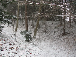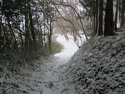 北郭境の堀切は西寄りが深く残りが良い。北郭の北にも小さな郭・堀があるらしいが、雪のため諦める。本丸西下の堀底を南へ向かうと、途中土塁の切れた場所がある。改変されたものだろうが、西へ出れば二本目の横堀となり、西側に土塁を伴う。