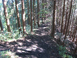 自然林の中を10分程度進むと、万葉広場から来る道が合流する。小さいが「冨士箱根トレイル」と標識が掛かっていた。この辺りから檜の植林された山道となる。右は急な下り斜面になっており、ようするにピークを通らず巻いて道が付けられている。ほぼ平坦と思っている内に、やや下り始める。左斜面の崩れた箇所には、歩きやすいように3ヶ所に丸太を4・5本置いた橋が架かっている。鞍部に近い場所2ヶ所は両サイドが落ち込んでいる以外は、一方が斜面となっている。二つ目の鞍部と思われる箇所を通過すると徐々に矢倉岳斜面に掛かったと思わせる。この周辺の植林地は、晴れているのに薄暗い。間引き・枝打ちが出来ていないためだろうか。右に地蔵堂への道を分岐し、さらに直進すると、周囲が自然林に変わる手前で山伏平へ到着。平と聞いて広い場所を想像していたが、数坪程度の場所である。左へ行けば21世紀の森・洒水の滝方面へ行く。洒水の滝は夕日の滝にも劣らないようなので、後日山北駅から散策をしてみたい。