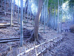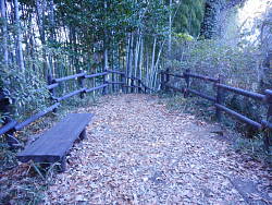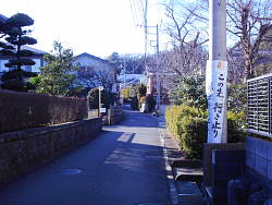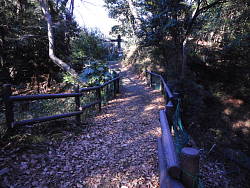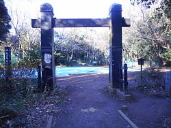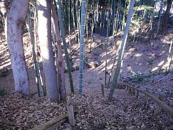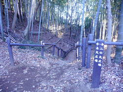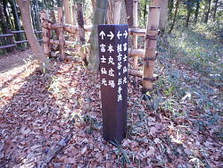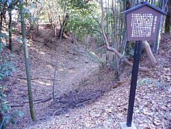 小さな曲輪の先はやや下り堀底と変わらなくなる。そのまま直進すれば井楼跡・二ノ丸へ行ける。防備の面では心もとないが、本によれば大きく変えられているらしい。再度本丸虎口に向かう。本丸土橋手間に、第三京浜で分断された冨士仙元への案内がある。