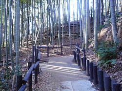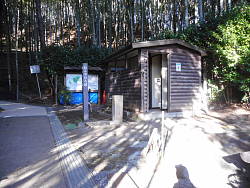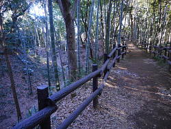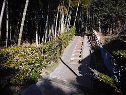 築城時の登城道とは違うかも知れないが、横浜線と平行に民家の間を行く。第三京浜の高架下手前で右折すれば先に城跡への入口が見えてくる。民家が終わった先に歩きやすいように整備された道が現れる。直ぐに根小谷(屋)広場と書かれた標識とトイレがある。曲輪跡なのか後の整備なのか分からず。