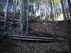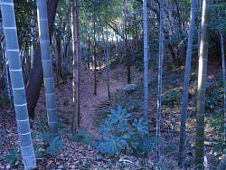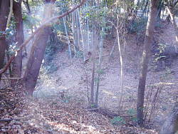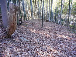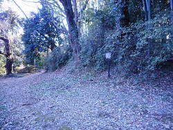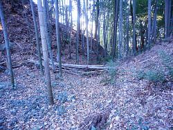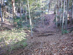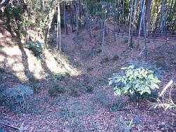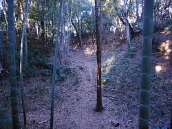 ここから簡易舗装の道になる。右斜面は幾段かの削平地と思われるものが見える。左下にも後に手が入ったかは分からないが、平坦場所がある。丁字路手前の両側は高くなり上は見えず、堀底を歩いている感がある。丁字路を右に行けば二ノ丸方面、本丸は左に進む。本丸方面から二ノ丸方面に深く幅広な空堀が続いている。
