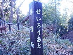 二ノ丸広場手前に井楼跡と標識がある。左右下の空堀側から散策路が来ている。