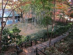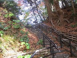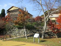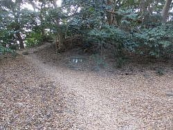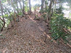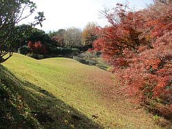 時季的に紅葉が見頃を迎えている。散策路を少し上がった場所に南門があり、入った右に公園管理事務所が建つ。この辺りがモミジが多く、かなりの散策者がスマホを構えている。管理事務所から緩やかな散策路が着けられているが、階段を上がると堀切状になっている。如何にも城跡らしいが、先人の書き込みでは散策路を付けた時のものかも知れないとある。