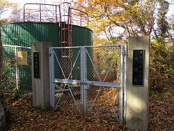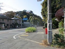しばらく歩けば先に緑色の物体が見え出す。見えだした所が最高点らしくあるので、道路地図のみに載る紅葉山(140m)ではないだろうか。緑の物体は神奈川県水道局・東小磯配水池とある。施設からは下り加減になる。尾根上からは左手に湘南平の東端に建つ鉄塔が見え出す。現在地より40〜50mは高そうだ。