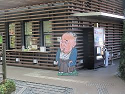 バス時間に間があり、旧吉田茂邸跡へ寄ってみた。入口の先の兜門と名が付いた門を潜る。なぜ兜なのか、説明板内容を覚えていない。内側の先に管理休憩棟があり、前に吉田茂の看板が立っている。よく見る葉巻を咥えた羽織・袴で杖を持った姿である。休館日で邸宅跡は入れないが、よく手入れされた庭が美しい。邸宅の反対側の高台に、銅像と七賢堂があったのだが見ずにバス亭に向かう。