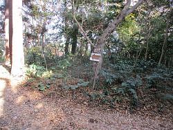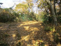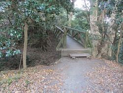 堀切状の先は郷土資料館と竹林が広がっている。右(南)に行けば両側が切れ込んだ痩せ尾根になり、右側に木橋が付けられている。先にはこんもりとした地形があり、物見でもあったのかも知れない。先は一気に東海道まで落ちている。