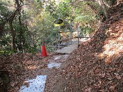 下りは続き水道施設からは湘南平の尾根に出るのに、一度50m位下がって登り返す。手前で見えた鉄塔あたりから倍以上を登るようだ。いつ崩れたかは分からないが、崩壊場所を通過する。登った先が湘南平と浅間山との鞍部になる。