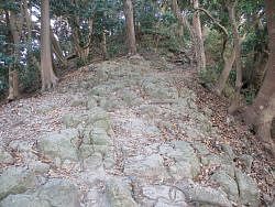 城の本郭跡になる。西側が一段高くなっており、下から見ると土塁跡を思わせる。土塁状の下は大堂と名があるのでお堂が建っていたようで礎石が幾つもある。お堂を建てるときに削平した残りが土塁に見えるとの意見もある。この本郭の北東に郭と堀切が存在するらしいのだが、下って登り返す気が起きず、またバス時間も迫り、今回は女坂経由で高来神社へ下る。