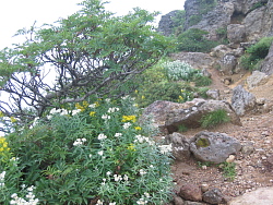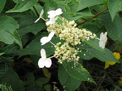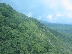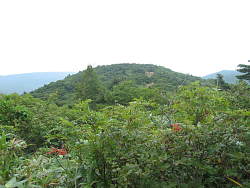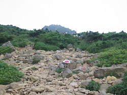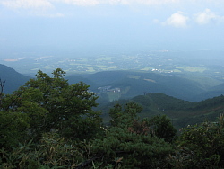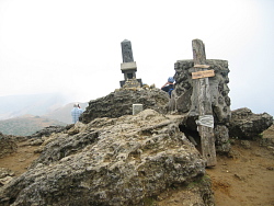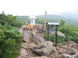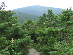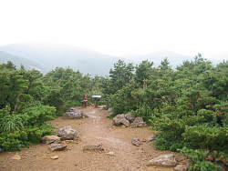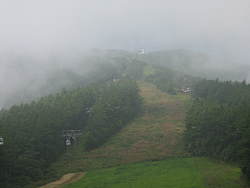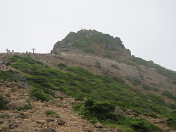 | 安達太良山(1699.9m) 三角点 二本松市/郡山市/安達郡大玉村 平成17年(2005)8月19日(金) 曇り/雨 参考地形図 安達太良山 温泉地に行くことは決まっていたが、さて何処がいいかとなるとなかなか決まらなかった。東北方面にと決め手はいたが、青森から福島まである。弘前などを含めて浅虫温泉なども候補に挙がったが、あまりにも遠すぎる。色々あって近場の岳温泉に泊まって安達太良山に行こうと決定する。出かける3日前だった。今回は電車を使って行くことにした。東京駅から新幹線で郡山へ、在来線に乗り換えて二本松駅まで行く。2日前の地震の影響で十数分遅れて出発のため、郡山ではホームを確認している内に在来線が出てしまった。次は1時間後。東北線もここまで来ると1時間に1本になってしまう。一端郡山駅構内から出て時間を潰す。やっと時間になり乗り込む電車が3両なのを見て、妻は感激したらしい。水戸・郡山間を走る水郡線は確か2両、仙台の上の古川から小牛田へは3両(4両だったか記憶が薄い)、小牛田からさらに乗り換えるのは2両だったのを覚えている私には、こんなものだろうとおもうのだが。二本松駅に着いてからは、私が意外に思った。イメージではもう少し大きい町並みと駅を想像していたからだ。駅舎は小さく、駅前はタクシーが多く止まっている以外にビジネスホテル・食堂・八百屋などちょっとしたお店があるくらいだった。ホテルの迎えには時間があるため、駅前の食堂に入って遅い昼食を摂る。 ![]() ![]() 迎えの車中の途中から山並みが近くに見え出すが、安達太良山辺りはガスっており、すっきり見えない。明日に期待したいが、このところ東北地区は雨が多い天気が続いている。運転手さん(ホテルの従業員)に聞くと、一昨日は良かったらしいが、地震がすごかったらしい。今までに経験しなかった揺れだったと言っていた。しかし岳温泉など周辺の建物などには影響はなかったらしい。15分程度で岳温泉に着く。早めに着いたため夕飯には時間があり、周辺でも散策しようと地図にも記載されている「鏡ヶ池」に向かった。温泉街からは500mほど下った処に池がある。目の前には大きなホテルが建っており、曇りと夕方の時間帯が重なって感激するほどの景色ではなかった。ホテルに戻り明日、山で食べる「おにぎり」でも頼めないかと思い従業員に聞くと、当ホテルは大きなホテルではないので、やっていないと断られた。その代わりに近くにコンビニがあると教えられた。車で来るときには気づかなかったが、岳温泉入口手前にコンビニが一軒あるらしい。 ![]() ![]() ![]() 朝食を摂ってから教えてもらったコンビニ「ファミリーマート」へおにぎり等を買いに行き、路線バスがないため戻ってタクシーを呼んでもらい、奥岳(安達太良山登山口)へ向かう。手前にはかなり広い駐車場があり、1/3程度駐車している。私たちが着いた時間が9時半で、山登りには遅い時間だったからだろうか。朝早く来てもゴンドラが8時30分からだそうだ。左手に富士急レストハウスがあり、その奥にゴンドラの駅がある。2階が切符売り場と乗り場だが、私たちはホテルとセット料金になっていたので安いチケットを持参していた。下から見ればゴンドラの山頂駅はガスがかかって霞んだり、全く見えなくなったりしている。順番待ちするまでもなく乗って動き出す。中程ではガスが切れて晴れ間が広がり、右手方向の斜面、尾根がよく見えだした。しかし山頂駅に着いた頃には周辺も含めガスが掛かってしまっていた。 ![]() ![]() ![]() 建屋から出て目の前に木道が敷いてある登山路となる。10m程で右に道を分け、薬師岳展望台方面とでている。地形図に表記されている薬師岳は、もう少し南の1322m付近かと思う。帰りに寄ったところ、山頂駅の北側が展望台になっているが、そこに薬師岳山頂と標識が立っていた。木道の両側は木々が生い茂っている。中には(ハクサン)シャクナゲの木も多く、時季であれば目を楽しませてくれるのだが。緩やかな登りが続く登山路である。で木々の背丈が低くなってくると目の前に安達太良山山頂が見え出す。別名乳頭山と書いてあったが、確かにそれらしく見える。しばらく行く仙女平分岐点に到着。仙女平経由が表登山口とあるため、信仰心から登っていた時代からの道らしい。 ![]() ![]() ![]() 仙女平辺りからは山頂は見えず、手前の綾面をトラバース気味に進んで行くと丸いドーム型の山頂が見える。この先は短い岩のごろごろした場所を少し登ると、山頂全体が見えてくる。岩の下に山頂標識があり、記念撮影をして私のみ岩の上まで登った。上には三角点と祠があり15人ほど休憩していたが、狭く30人居たら動けないような場所だ。しかし薄くガスっているが展望は良いのがわかるため、この天気でなかったらどんなに良かったか。昼食をとり一息入れていたら突然の土砂降りになった。岩の上に居た人たちも慌てて下りてきたが、下でも雨宿り出来るところはなく、雨具を
