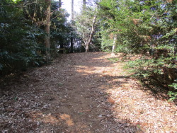 本丸の南側の一部は伐採され、眺めが良い。本丸から土橋を渡って二の丸(推定)へ向かう。二の丸も南側を除いて土塁が残っている。ただ東は土塁だろうと言う程度だが。南西の土塁は良好で、隅は物見台跡と言われる。外曲輪へは西に直接出られないため、公園入口に戻り西へ向かう。左は二の丸、右は住宅地になっているが、堀だった面影をよく残す。