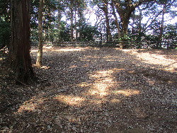 西に回り込むと規模の大きい土塁を思わせる遺構がある。車両が通れるように道が造られ、遺構を分断している。上に上ってみれば、土塁ではなく小さな曲輪を感じさせる平坦地になる。