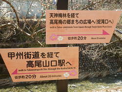 圏央道の真下まで来ると、旧甲州街道沿いに[高尾梅の郷まちの広場]があり、トイレもあり休憩している人が多い。まちの広場下は案内に載っていないが、小規模な梅林がある。遊歩道は少し先で旧甲州街道に合流する。旧甲州街道を少し行くと、摺差バス停横に[湯ノ花梅林]があるが、入口は封鎖され中には入れない。裏高尾・日影バス停を過ぎ、大きくカーブした先で右折し中央線を潜り、数分登れば中央高速の先に木下沢梅林がある。