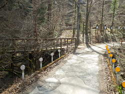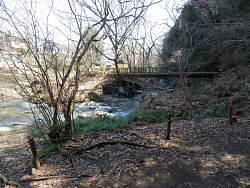 所々に標識があり良く整備されている。途中で[小仏関跡]の標識があり、遊歩道から旧甲州街道に出れば関所跡に着く。規模は小さいが関所梅林があると載っている。やがて遊歩道から梅は消えて、南浅川沿いを右岸に渡る。渡った先は私有地の看板があり、植物等保護のためロープで規制している。いつしか植林地になっている。