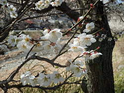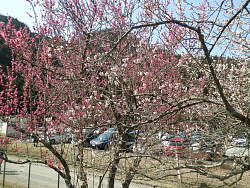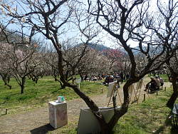 梅林内は無料だが、入口に募金箱が置いてあり、幾らか募金をして入る。緩やかに登り入口の反対側には簡易な露店が出ており、地元の和菓子・梅ジュース・焼き芋・アクセサリー等を売っている。園内は1400本植わっているとあり、ここまでで一番大きく、やや遅れているが見応えはある。