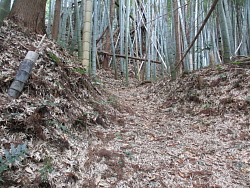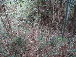 帯郭の北斜面は深く落ち込んでいる。東端まで行くと竹林でよく見えないが、下は腰郭らしい。