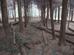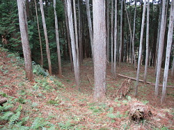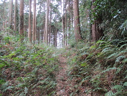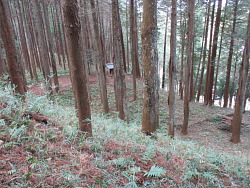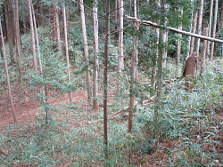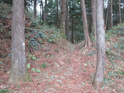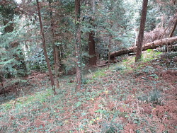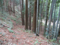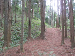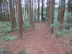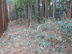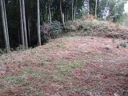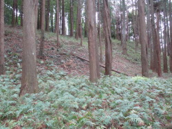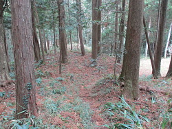 二の郭内は杉・檜林となり暗く、下草は多くはないが歩きづらい。一部下を覗けるが、西から南の斜面側は郭内より鬱蒼とし一部で僅かに法面が見える程度。東端は下に主郭境の堀がよく分かる。幾つかの堀があるだろうが、全体に土塁を含め見当たらず、腰郭・帯郭など高低差で防御していたのか。