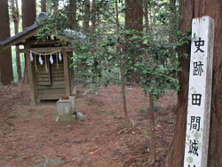 主郭と二の郭を区切る堀切を通り、先には主郭と二の郭を合わせた長さの帯郭がある。北端に田間神社元宮と田間城跡の標識が建っている。