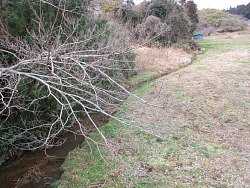 ガンガン坂は訪問せず城山団地に寄ってみた。団地東下に小川が流れる幅広な低地があり、縄張図では東を守る天然の堀のようだ。山小屋と呼ばれた一帯の台地は戸建て住宅団地となり、整地時の境には熊野神社・城山公園がある。社殿の建つ平地は名残ではないと思うが、城側は木々が鬱蒼とし踏み込めない。