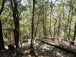 一部で尾根歩きの場所があり、七社権現洞への入口が現れる。標識は左後ろに登るようになっている。脇には像が置かれており、[是ヨリ先、五拾米行ッテ右折]と七社権現洞を指さしている。大月市の案内書ではかなり大きな洞窟らしい。尾根以外は道の抉れた所が多く、斜面側に設けられた手摺りの基礎が浮いている場所も目立つ。