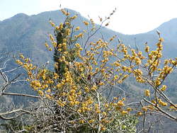 山頂から戻り東登山口へ向かう。公園側には及ばないが、下り始めてしばらくは、南側が開けて眺めが良い。正面に最初に扇山が、下がるに連れ百蔵山が見えるようになる。この辺りには黄色のダンコウバイがひときわ目立っている。