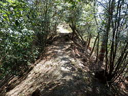 馬場跡の先に東登山口に下る分岐がある。山頂側に少し入った場所が[蔵屋敷跡]とある。ミツバ躑躅が二株ほど咲き始めている。その一段上が山頂(本丸跡)で、手前に[大月市・岩殿山無線中継所]、奥に[YBS]のアンテナ施設が建っている。狼煙台と標柱がある場所が634mの最高点。アンテナ施設建設で地形は変わっているかも知れない。周囲の陽だまりにカタクリが数株咲いている。標識に[空堀・岩殿円通寺跡]と記されており、アンテナ施設横を東に行くと空堀跡が見え、空堀を越えて先に踏み跡が見える。ここを下ろうとしたが、結局戻って東登山口標識に従った。山地図にも東登山口のルートが途中で分かれている。