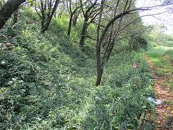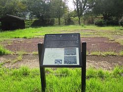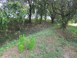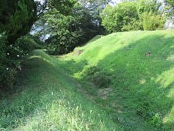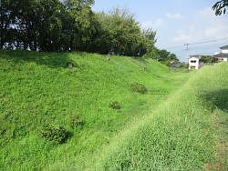 見学用駐車場が遺跡の北に書いてあるが、不案内のため東の県立ワインセンター脇の東入口に着き、道脇に駐める。ワインセンターは東郭の南半分を占めている。目の前に主郭の土塁・堀が現れる。