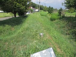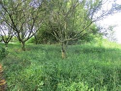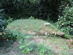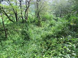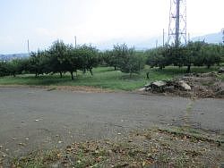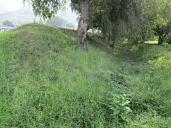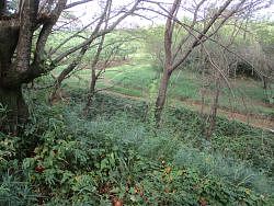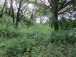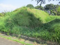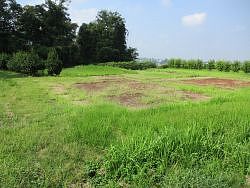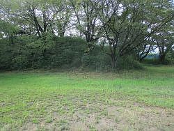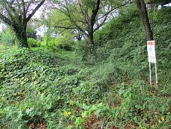 土塁法面、空堀には雑草が生い茂り、土塁の上(南東・南西・北西)に東屋が建つが、腰より高い草で北西の東屋一ヶ所に登ったのみ。 大きく崩された南虎口から道路に出て西に向かうが、木々・草が多く諦めたが、東屋から西下を見れば桃畑が広がり、西辺の堀が見え、再度桃畑に入らせて貰い堀を確認しに行く。説明板にあった「ごんぱち塚」と思われる高まりがあるが、これがそうなのか分からない。また謂われも不明。