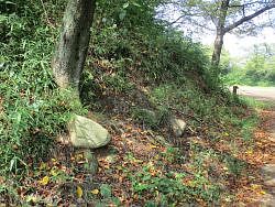 東辺の堀だが、南端に東門跡があり、石積みが確認出来る。虎口はL字に折れが付けられている。戻り北側に向かう。主郭の北は果樹畑が広がるが、縄張図には外堀が記されたいる。第2期の縄張だろう。