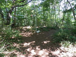 3月の扇山下山と同じ道だが、しばらく見えていた百蔵山は茂った葉で微かに分かる程度だ。林道終点(始点)を過ぎ、分岐から約33分で水道施設を通過する。