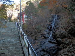 石段を上がって仁王門を潜りれば、更に石段が続く。仁王門を潜った先で右先に滝が見え、前滝と言うらしい。他にも幾筋もの滝があり、雄滝が落差140メートルらしい。仁王門から上まで200段程の段数があった。本堂脇から右手の斜面に登山道が付けられており、沢に架かる赤い橋を渡る。