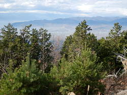 緩やかに登れば大滝山山頂に着く。私設の山頂標識は宮宕山としている。山頂付近は山火事の難を逃れたのか木が残っているが、展望はないに等しく、北?側の狭い範囲がやや木が少なく遠景が透けて見える。往路を富士見台手前まで戻る。