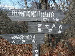 宮宕山は三つのピークがあり、富士見台側から無名ピーク(1120m強)、中央が甲州高尾山(1106m)、西端が嶮ヶ峰で三角点があり、標高(1091.9m)と一番低い。甲州高尾山の標識には(1106m)と記載されているが地形図では