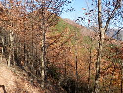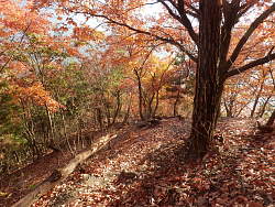 740m辺りに鉄塔が建っている。自然林が多くなり陽に映えて美しい。登山道は南に向かって下るが、急斜面のうえ、落葉が道を覆い尽くしており時間がかかる。国道20号と粕尾古戦場跡がある深沢入口の交差点が見渡せる場所では、斜面にソーラーパネルが広く設置されたいる。