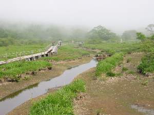 梅雨の最中、一瞬、日は差すもののガスが周囲を覆ってます。緑の中にレンゲツツジが最後の花を飾っており、キスゲが咲き始めました。