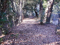 ここから簡易舗装の道になる。右斜面は幾段かの削平地と思われるものが見える。左下にも後に手が入ったかは分からないが、平坦場所がある。丁字路手前の両側は高くなり上は見えず、堀底を歩いている感がある。丁字路を右に行けば二ノ丸方面、本丸は左に進む。本丸方面から二ノ丸方面に深く幅広な空堀が続いている。
