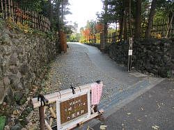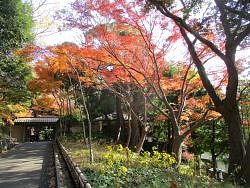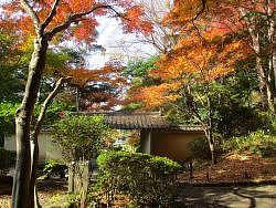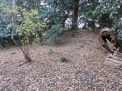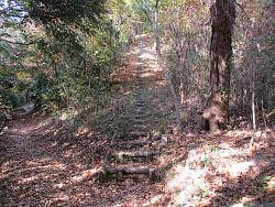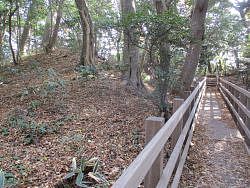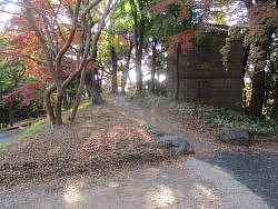 時季的に紅葉が見頃を迎えている。散策路を少し上がった場所に南門があり、入った右に公園管理事務所が建つ。この辺りがモミジが多く、かなりの散策者がスマホを構えている。管理事務所から緩やかな散策路が着けられているが、階段を上がると堀切状になっている。如何にも城跡らしいが、先人の書き込みでは散策路を付けた時のものかも知れないとある。
