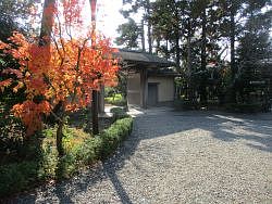 バス時間に間があり、旧吉田茂邸跡へ寄ってみた。入口の先の兜門と名が付いた門を潜る。なぜ兜なのか、説明板内容を覚えていない。内側の先に管理休憩棟があり、前に吉田茂の看板が立っている。よく見る葉巻を咥えた羽織・袴で杖を持った姿である。休館日で邸宅跡は入れないが、よく手入れされた庭が美しい。邸宅の反対側の高台に、銅像と七賢堂があったのだが見ずにバス亭に向かう。