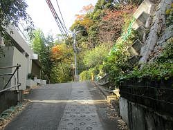 しばらく歩けば先に緑色の物体が見え出す。見えだした所が最高点らしくあるので、道路地図のみに載る紅葉山(140m)ではないだろうか。緑の物体は神奈川県水道局・東小磯配水池とある。施設からは下り加減になる。尾根上からは左手に湘南平の東端に建つ鉄塔が見え出す。現在地より40〜50mは高そうだ。