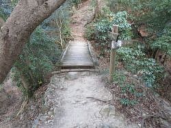 鞍部にもどり登り返せば浅間山(180.8m)に着く。一等三角点が社の後ろにある。以前は北側の眺めが良かった気がするが思い違いかも知れない。浅間山からはやや下り鞍部になる。少し行けば木橋が現れるが、高麗山が城だった頃の堀切とある。さらに先にも堀切があり、登りがやや急になる。尾根上も歩けるが散策路は右を巻いて進み、高麗山の山頂に出る。