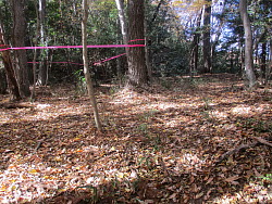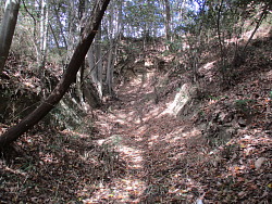 社殿の右手に小振りな稲荷社があり、横を通り山道に入ると直ぐに私設の展望台を過ぎる。横移動から縦移動に変われば、竪堀6の底を登る。左には竪堀7が平行する二重竪堀。竪堀6・7は合流し上に。落ち葉が多く滑りやすい、下りは特に滑りそうだ。