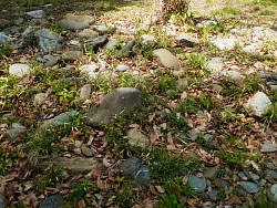 鉢形城本丸跡の石柱がある後ろにも土塁が見られ、土塁の先は眼下に荒川・寄居市街などが、新緑の樹間から眺められる。また近くに川原石らしきものが多く集められている。公園整備するときに集めた、何かの遺構だろうか。