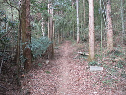 小川町の「パトリシアおがわ一般車駐車場」が城跡見学用に駐車可能で、敷地に城跡の案内が立っている。車道に出て標識通りに山側に向かうと、すぐに杉林の中を歩き、傍らに見学用の杖が何本も置かれている。