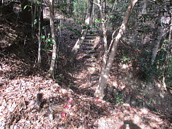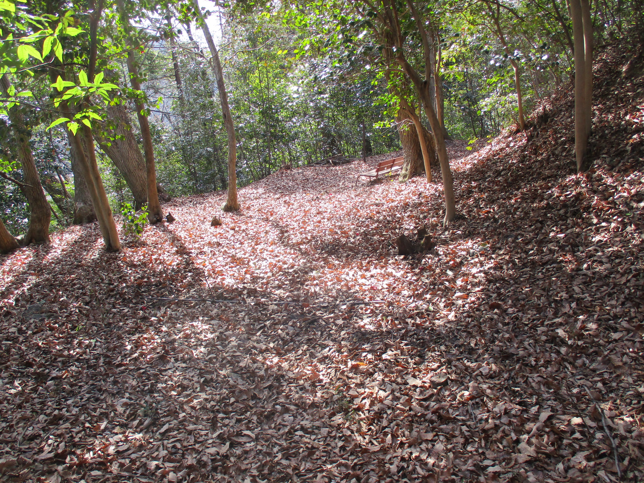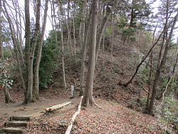 本郭下を水平移動すると、急に下る手前に二の郭経由本郭への道が付けられているが、ロープが張られ通行禁止のため迂回して、西の郭から回り込むしかない。下れば大きな帯郭がある。二ヶ所ほどベンチが設けられている。